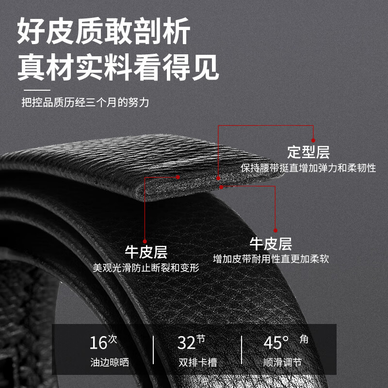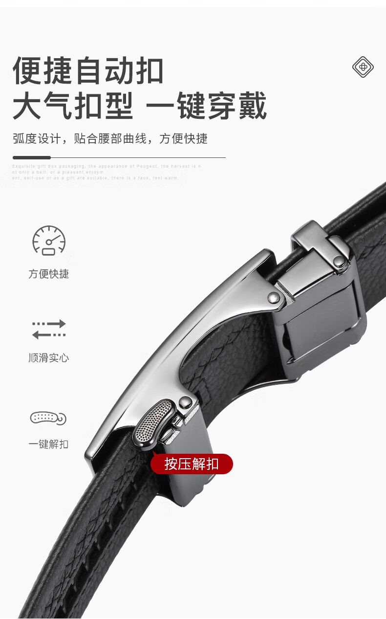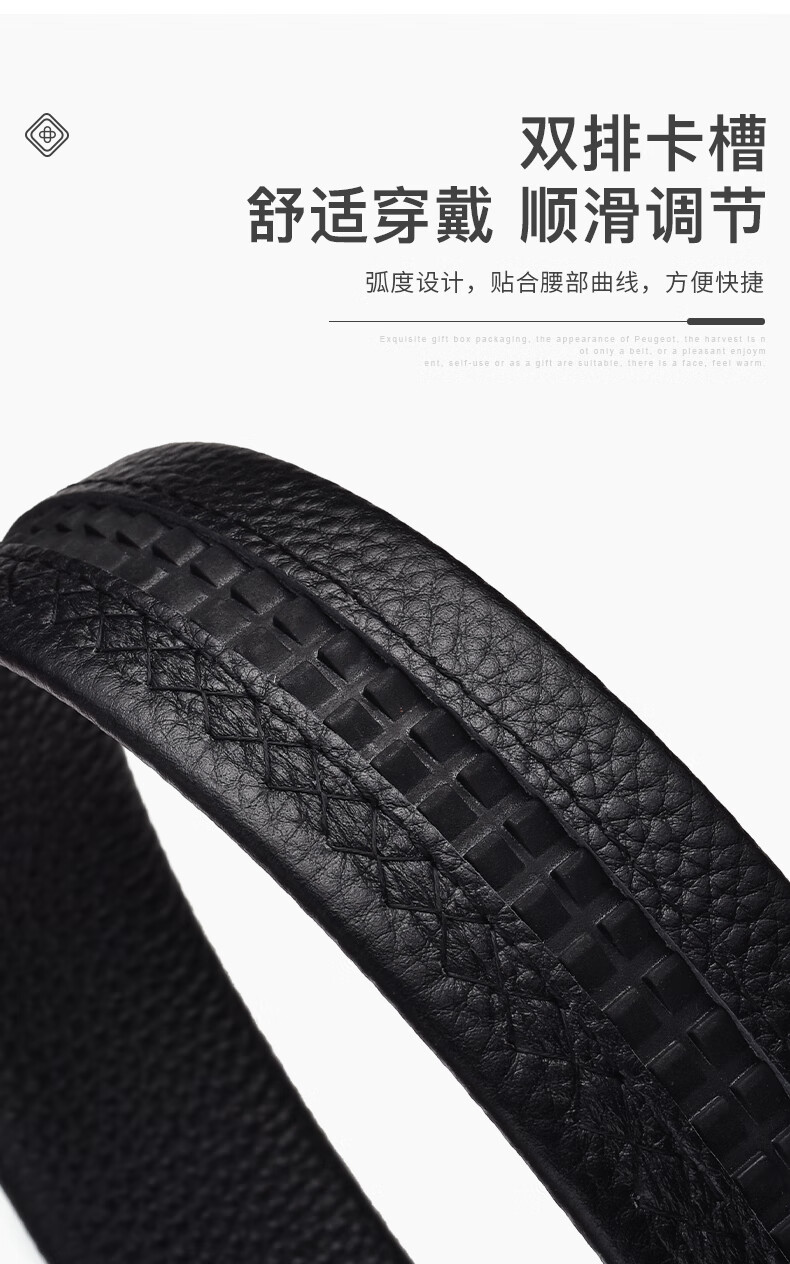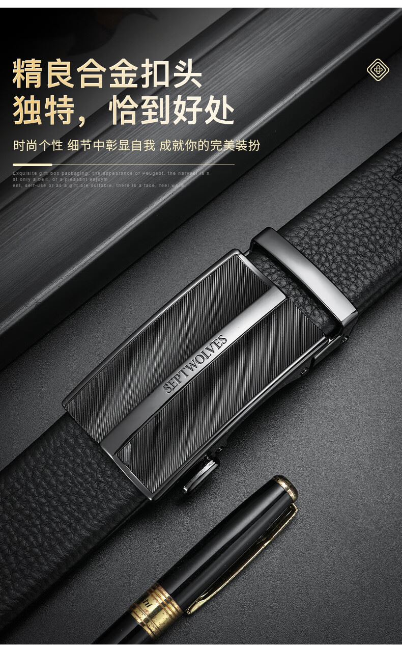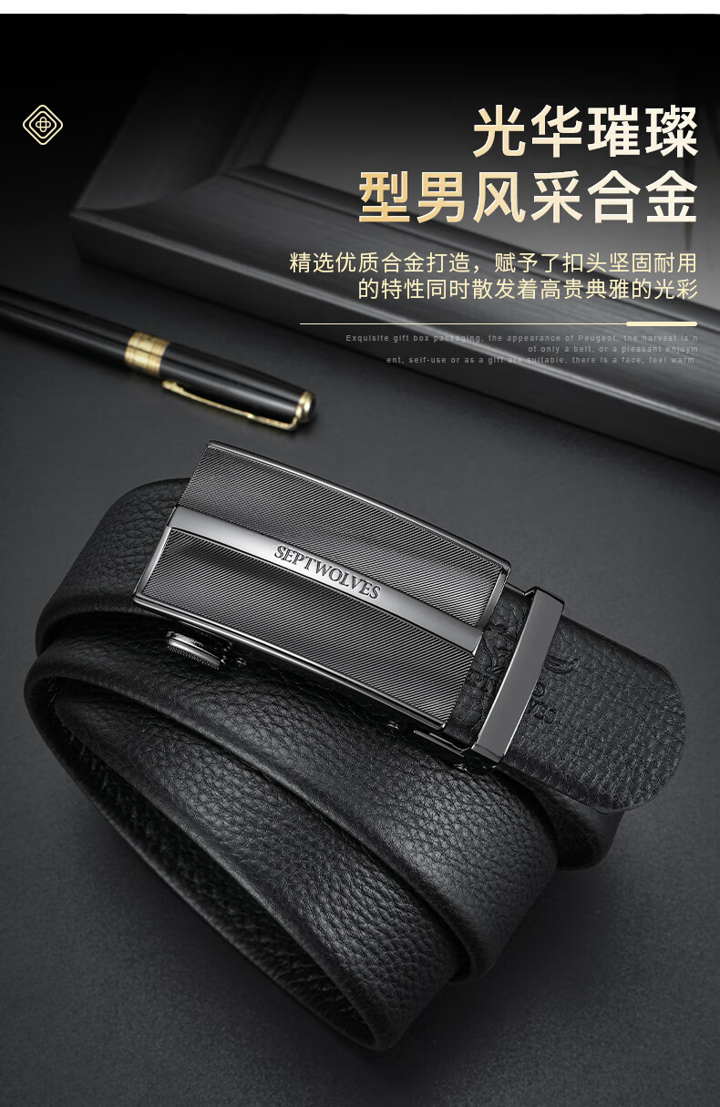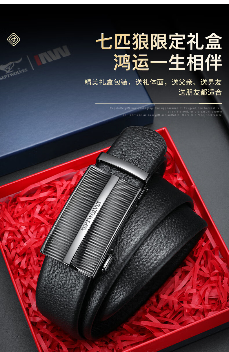 工藝:光面 帶扣:自動扣 主體材質:頭層牛皮 帶扣材質:合金 風格:通勤風 商務風 寬度:3.5CM 送愛人,送長輩,送男士 時尚設計扣頭,經典個性,簡約百搭,磨砂背扣,材質柔軟,手感舒適,經典狼標LOGO 代寫賀卡,傳遞心聲,精美禮盒,送禮佳品