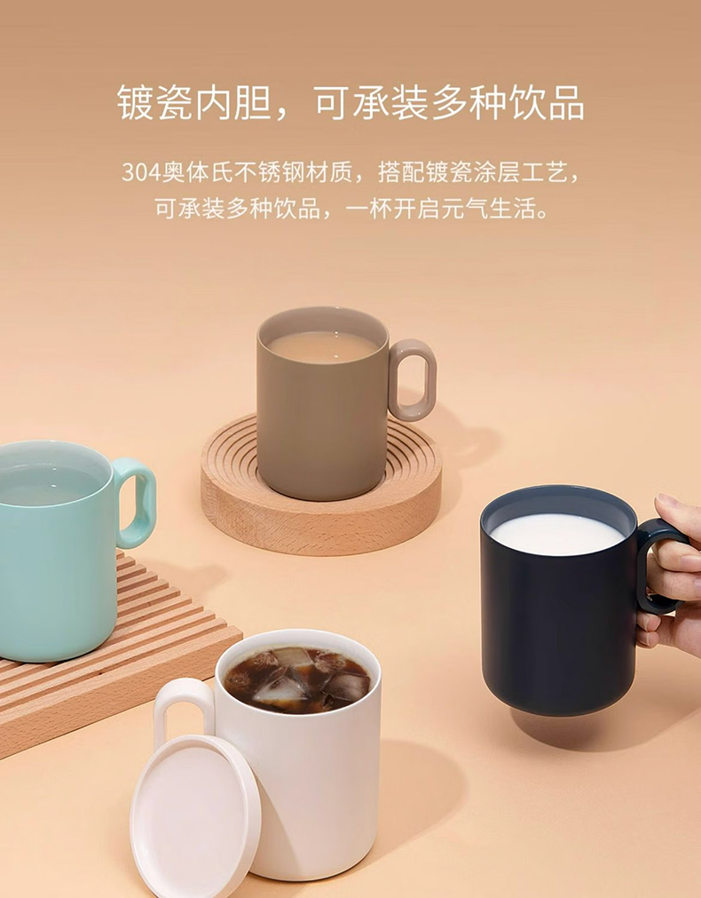3、304奧體氏不銹鋼材質+鍍瓷涂層,可承裝多種飲品。